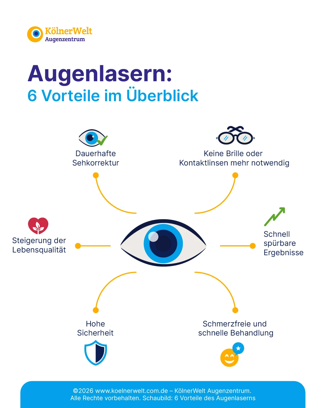 Möchten Sie morgens aufwachen und sofort alles scharf sehen, ohne erst nach Ihrer Brille greifen zu müssen? Haben Sie genug von gereizten Augen durch Kontaktlinsen beim Sport oder bei der Arbeit? Das Augenlasern bietet eine moderne und dauerhafte Lösung, um Fehlsichtigkeiten wie Kurz-, Weit- oder Stabsichtigkeit effektiv zu korrigieren. In diesem Artikel erfahren Sie, welche vielfältigen Vorteile eine Laserbehandlung für Ihre Lebensqualität bereithält. Das KölnerWelt Augenzentrum unterstützt Sie dabei, den Traum von einem Leben ohne Sehhilfe wahrzumachen.