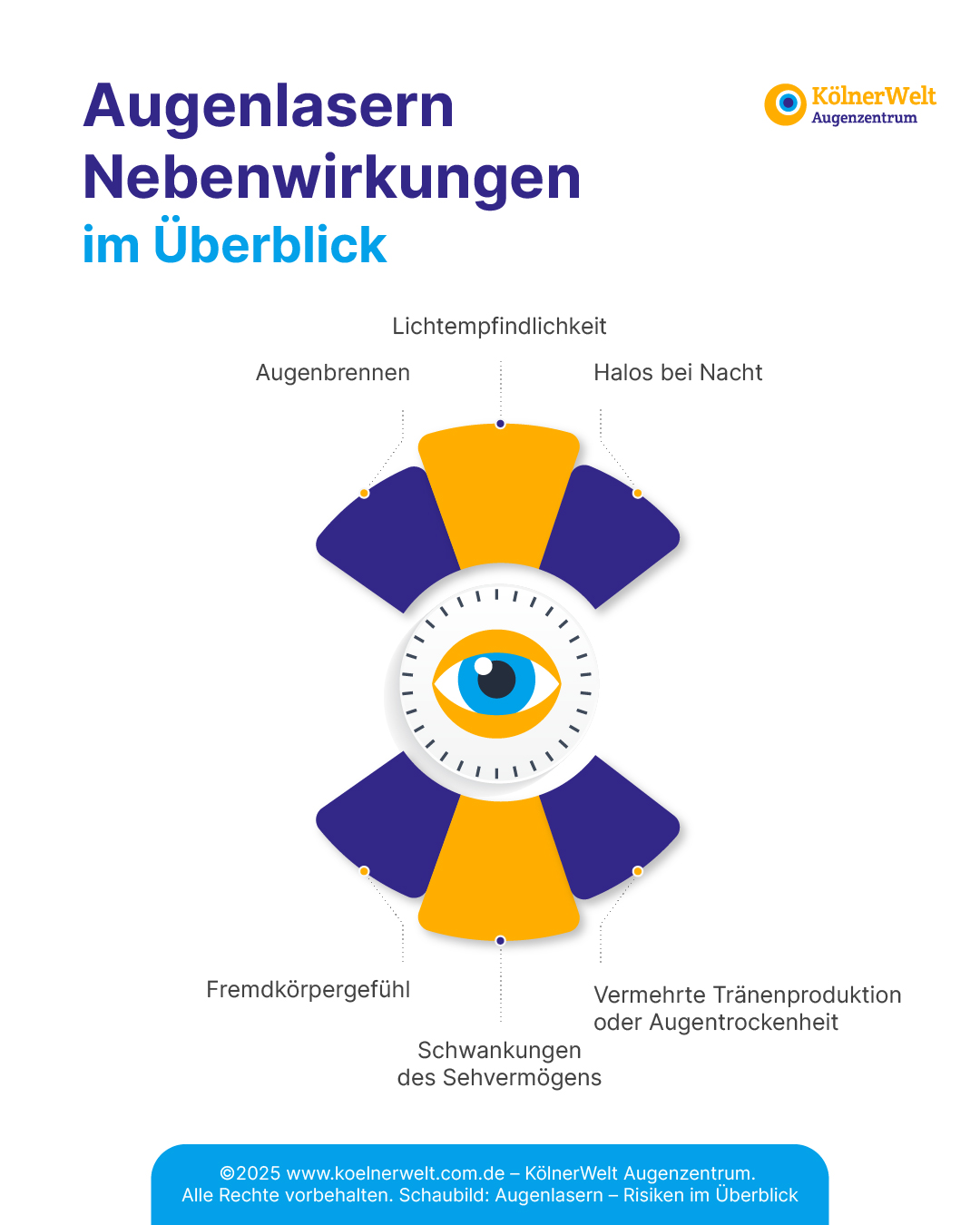 Beim Augenlasern können Nebenwirkungen wie trockene Augen, Blendempfindlichkeit, Halos bei Nacht, selten Infektionen oder Über- bzw. Unterkorrekturen auftreten. Diese sind meist temporär und gut behandelbar.